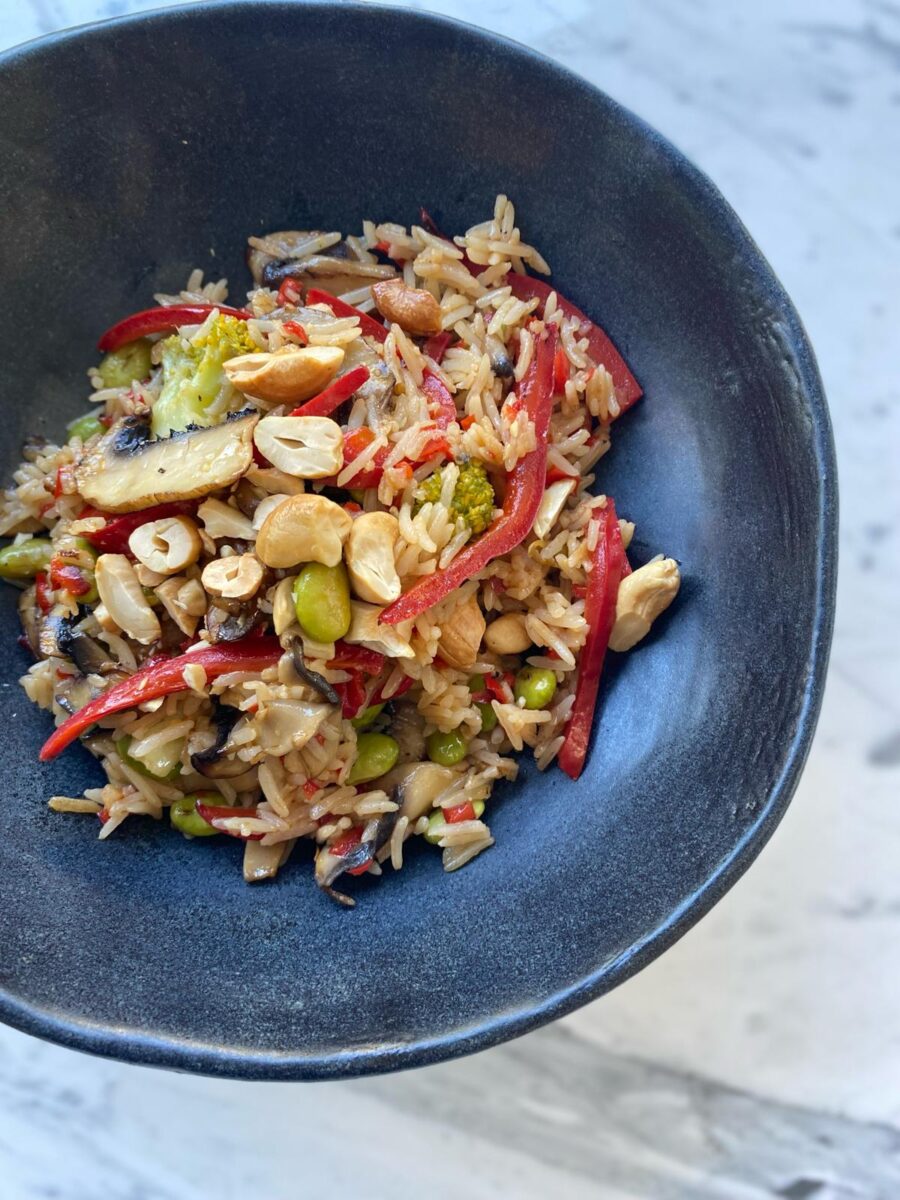 bell peppers, chestnut mushrooms, edamame, broccoli, and boiled basmati rice, with sweet chili sauce, fried rice