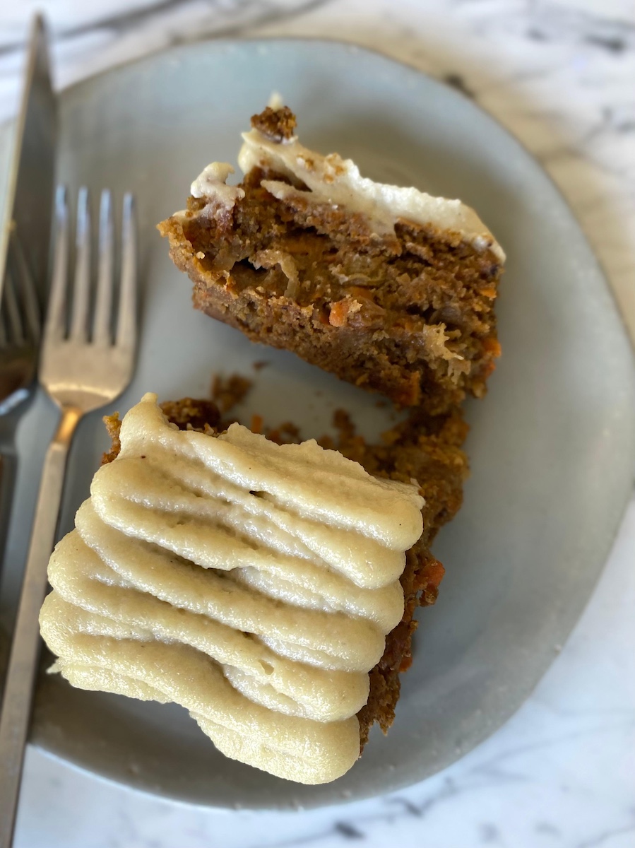 GF OATMEAL CARROT CAKE WITH RAISINS, BANANA AND NUTMEG, WITH CASHEW CREAM SWEETENED WITH DATE JUICE