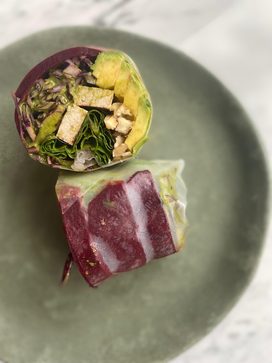 marinated tempeh with plant-based yogurt & tomato paste wrapped in glutenfree lavash, caesar dressing, parm chips, glutenfree croutons, pickles