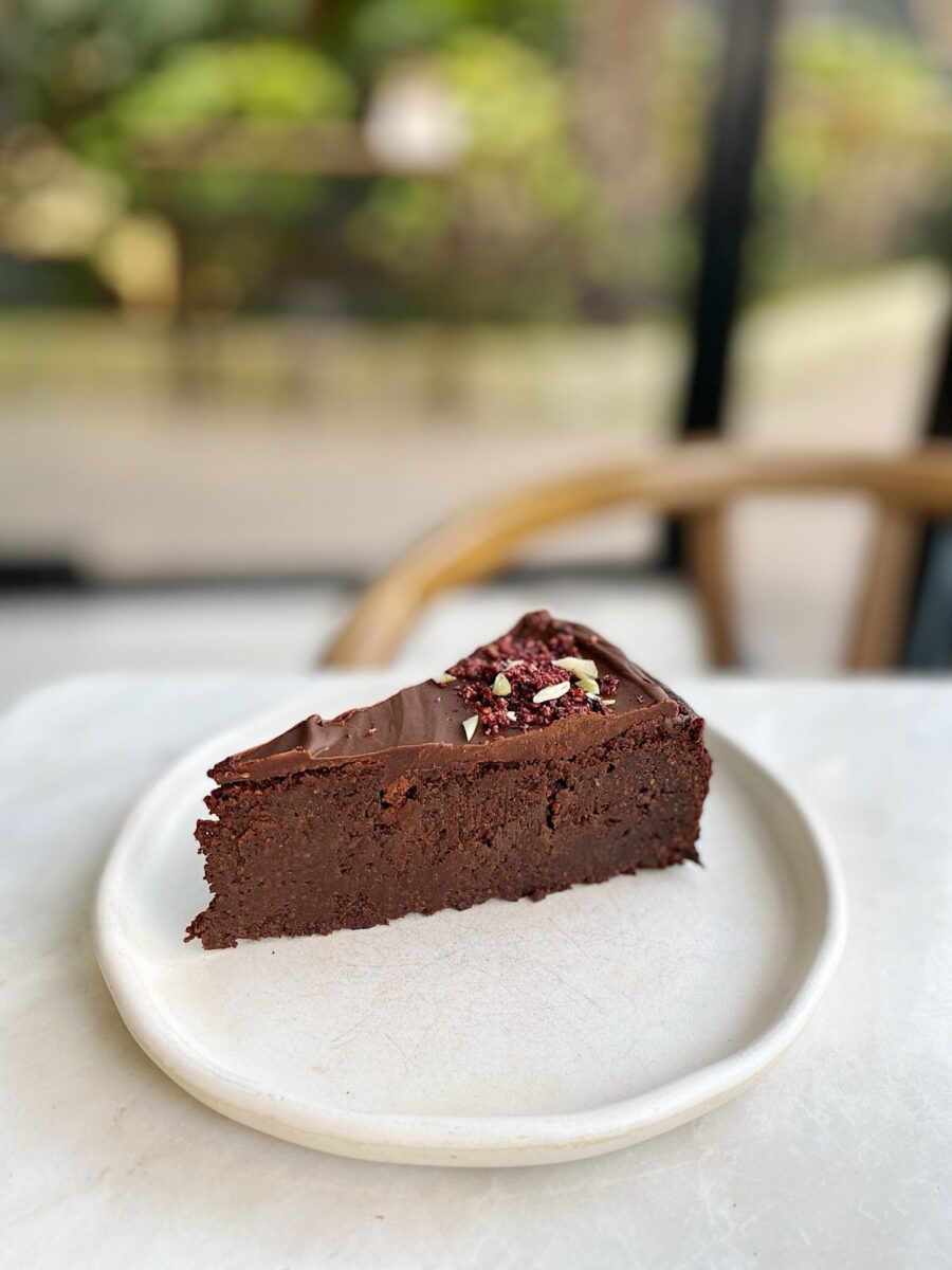 yulaf unu, kepekli pirinç unu, zeytinyağı, hindistan cevizi yağı, hurma suyu ve muz ile tatlandırılmış kek tabanı üzerinde çikolata ganaj ile